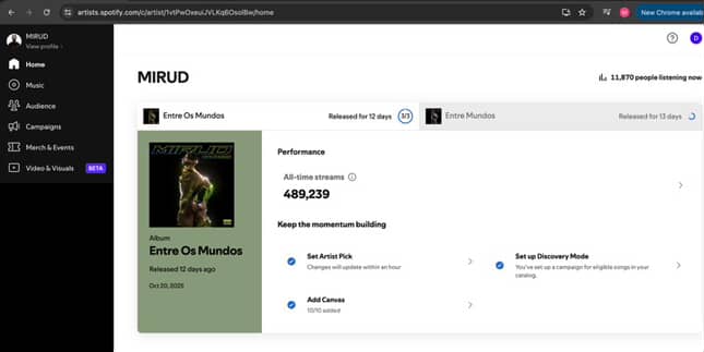 MIRUD's music has charted in Venezuela, Argentina, Mexico, Brazil, Paraguay, and the Dominican Republic. His previous albums, "Entre os Mundos" (Portuguese) and "Entre Mundos" (Spanish), reached Top 10 positions on Latin American charts.