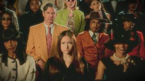 Ashwin Gane as Inspector Gane seated among a stylized audience of suspects in a still from the Flip Dat cinematic universe, where mystery meets retro flair